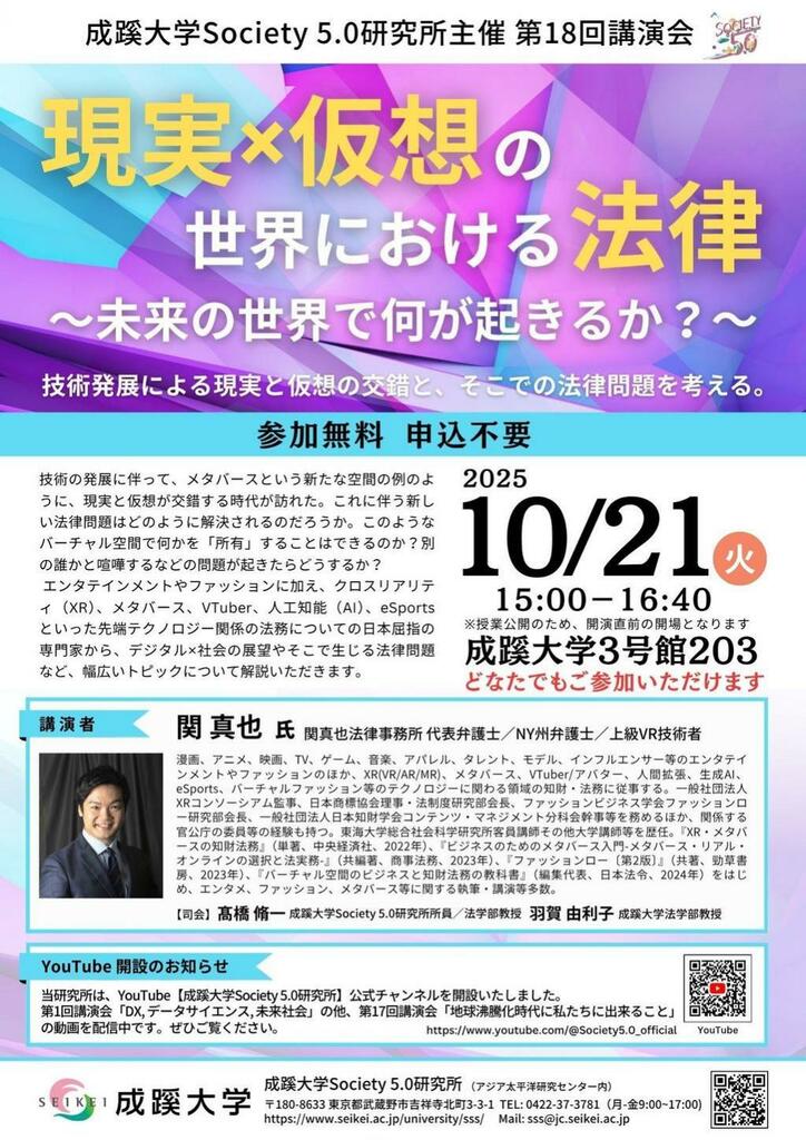成蹊大学(東京都武蔵野市、学長:森 雄一)は、2025年10月21日(火)に成蹊大学Society 5.0研究所主催第18回講演会「技能・感覚のデジタルコンテンツ化と法的課題―モーションデータと声の権利を題材に―」を開催します。