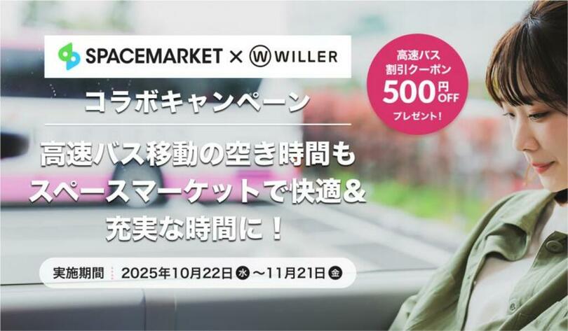 あらゆるスペースを貸し借りできるマーケットプレイス「スペースマーケット」を運営する株式会社スペースマーケット(本社:東京都渋谷区、代表取締役社長:重松大輔、以下「スペースマーケット」)とWILLER MARKETING株式会社(本社:大阪府大阪市、代表取締役社長:辻本 宗男、以下「ウィラーマーケティング」)は、夜行バス降車後の早朝の身支度・休憩ニーズに応えるコラボキャンペーンを、2025年10月22日(水)より開始いたします。両社の会員を対象に、それぞれのサービスで使えるお得なクーポンを相互に配布し、「移動後も安心して楽しめる体験」を提案します。