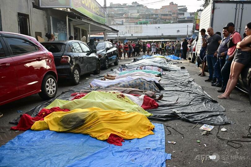 【10月30日 AFP】ブラジル・リオデジャネイロのファベーラ(スラム)の住民が29日、警察が過去最大級の麻薬密売人の取り締まりを実施して少なくとも119人が死亡したことを受け、路上に遺体を並べた。この事件により、貧困地域に根を張る麻薬組織との闘いの是非が改めて注目を集めた。