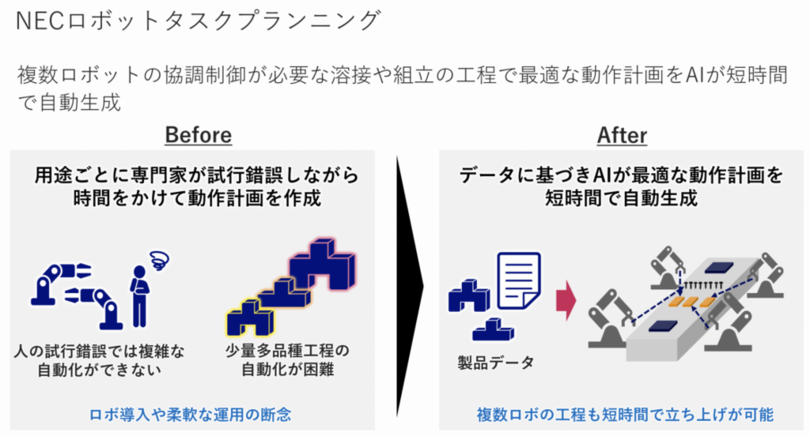 NECの「BluStellar (ブルーステラ) 」イニシアチブの一環として提供されるNECロボットタスクプランニングソフトウェアには、AIを利用して複数のロボットの協調動作を最適化し、ロボットの動作プランを自動で生成する独自のアルゴリズムが備わっています。