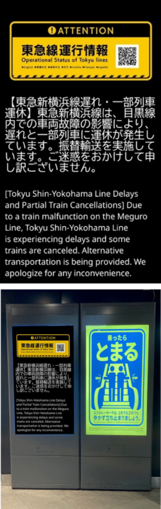 「東急線運行情報メール」の文字情報や、「駅係員による構内案内放送」の音声情報をCotopatⓇに入力し、必要とされる言語に翻訳したうえで駅設置のサイネージモニターにタイムリーに表示することができます。