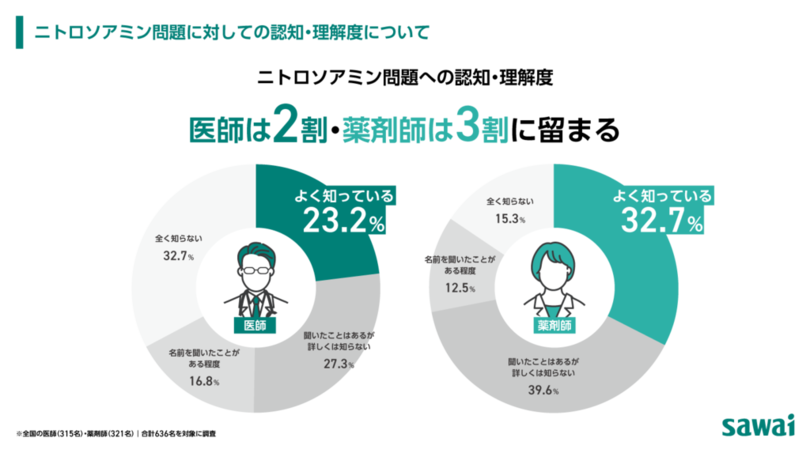 沢井製薬株式会社(本社:大阪市淀川区、代表取締役社長:木村元彦)は、昨今、医薬品業界の目下の課題である「ニトロソアミン問題(※1)」に注目し、当問題における医療現場の実態を把握すべく、全国の医師・薬剤師(合計636名)を対象にインターネット調査を実施しました。