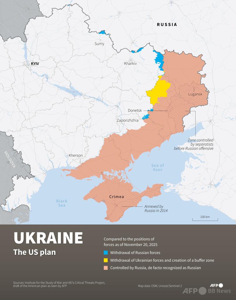 AFPが確認した和平案は、ウクライナ軍が今も保持している地域から撤退することを求めており、これによりロシア側は一発の銃弾も発射することなく領土を約2300平方キロ増やすことになる。