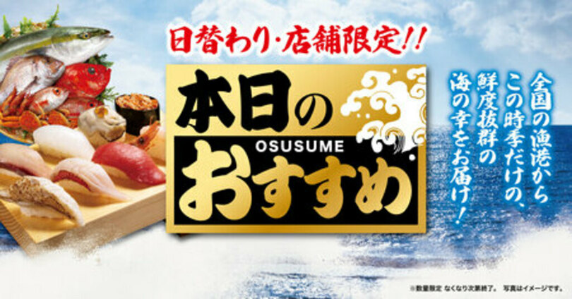 そして、この仕組みを生かした新企画として、この度、「本日のおすすめシリーズ」を実施します。まずは、東京、大阪などの計60店舗でスタートし、都市部にいながら、離れた産地の新鮮な魚も手軽にお楽しみいただけます。水揚げ地の加工場や自社セントラルキッチンで加工を行うことで、より鮮度のいい状態での提供と効率的な輸送が可能となり、各地の旬の魚や高級魚などを日替わり(※)で一皿350円にて販売します。旬の時期に合わせて、提供魚種は切り替えていく予定です。