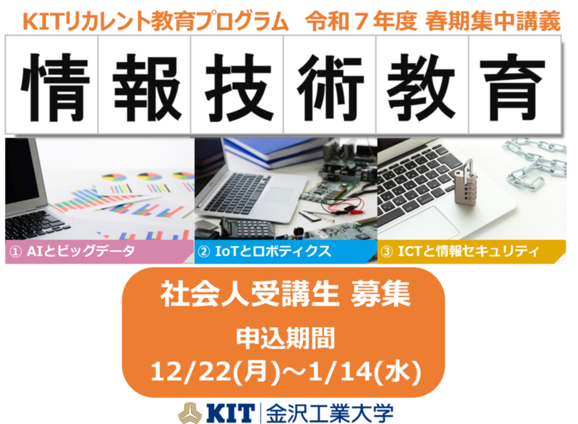 金沢工業大学では、社会人が学生や教員と共に学び合う「KITリカレント教育プログラム」の募集に先立ち、ホームページにて情報を公開しました。募集は12月22日(月)より開始します。2~3月の春期集中講義期間にAIやIoTを中心とする「情報技術教育プログラム」13科目を開講します。