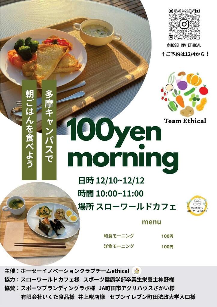 今回は、多摩キャンパスに通う学生に温かく栄養のある食事をとってもらうことで、朝食の重要性を知ってもらいたいという思いから「100円モーニング」企画を実施します。