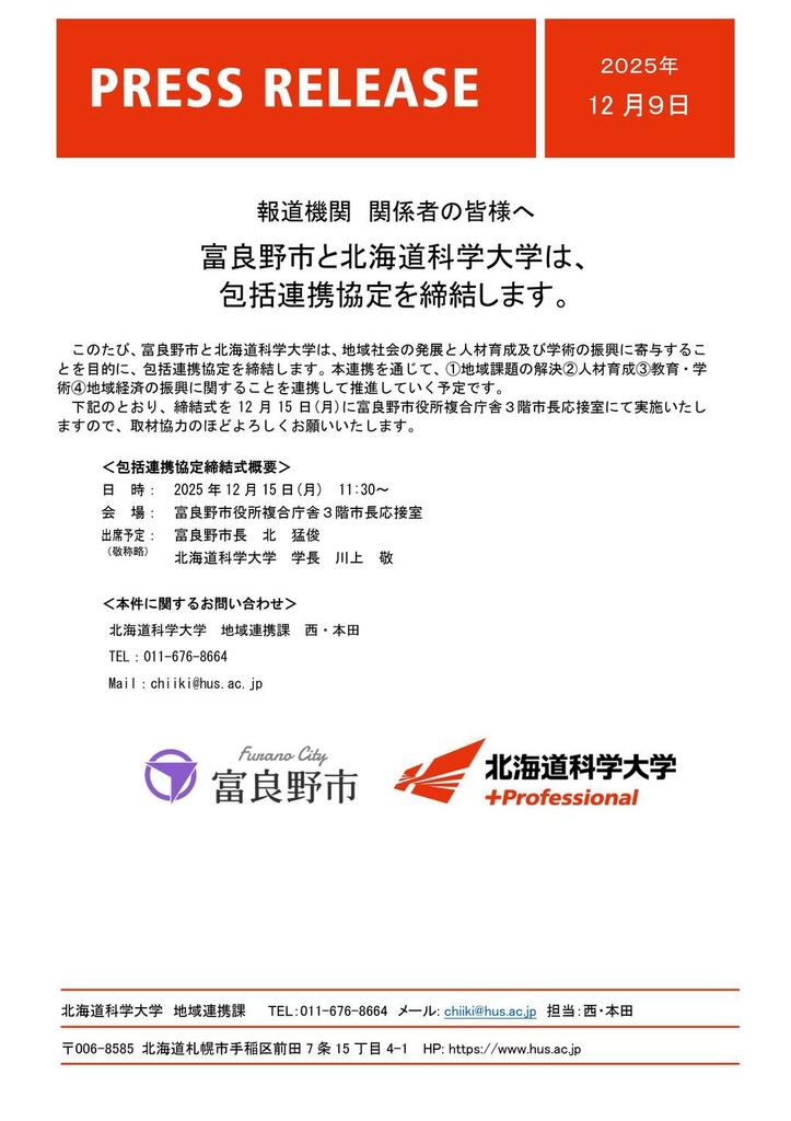 2025年12月15日(月)、北海道富良野市と北海道科学大学は、包括連携協定の締結式を実施します。