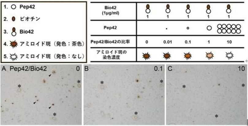 (図1上段)投与するAβとして、凝集性が最も高いAβ42を合成し(左枠内1: Pep42)、可視化するためにPep42をビオチン(2)で標識してBio42 (3)も作製しました。アミロイド斑と結合したBio42は茶色に染色されます(4)が、ビオチン標識されていないPep42は結合しても発色されません(5)。Bio42の量を一定に保ちつつ(1μg/ml)、Bio42と競合するPep42の量を増やしてAD脳組織切片に投与すると、Pep42/Bio42の比率が0.01、0.1、1、10と高くなるにつれて、Bio42の結合はPep42によって阻害され、アミロイド斑の染色濃度は減少します (右表)。(下段図)組織競合結合アッセイ法による代表的な染色結果です。Bio42はアミロイド斑に結合して茶色く染色され(矢頭)、血管壁(*)にも結合しています(A)。Pep42/Bio42の比率が0.1(B)、10(C)と高くなるにつれ、染色されるアミロイド斑の染色濃度と数が減少しています。