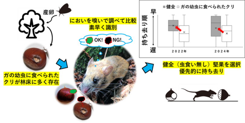 まず、落下したクリ堅果の内部状態を調べると、ガの幼虫が食べて脱出した堅果(ガ類幼虫脱出済み堅果)が多く存在していました。したがって、この虫害堅果と、野ネズミは高い確率で遭遇していると考えられます。次に、この虫害堅果を健全堅果と同時に林床に置いたところ、野ネズミは健全堅果を先に持ち去りました。また、画像解析によって、においを嗅いで素早く堅果を比較し、調べていたことが確認されました。さらに、堅果を調べた方が、健全堅果を持ち去る割合が高まることも見出されました。