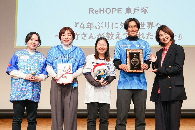 「人生100年時代の物語大賞」は、サントリーウエルネスが推進する、高齢者施設のご入居者の方々が地元サッカークラブを応援するプロジェクト「Be supporters!(Beサポ!)」の取り組みのひとつで、参加施設で生まれた物語を募集し、表彰するものです。ファイナリストにノミネートされた5組のうち、全国1万名超による一般投票を含む選考によって、得票数順に決定します。ReHOPE 東戸塚は第三位のブロンズに選ばれました。