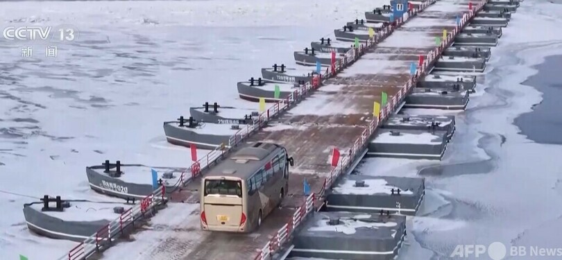 結氷した川に浮き箱を固定したこの浮橋は冬に建設して春に撤去する方式で、毎年黒竜江の夏季の水運が停止して川が凍結した後に架設され、翌年4月初めに黒竜江の氷が溶け出す前に解体するもので、毎年の運用期間は約90日です。同江通関地は中国とロシアを水路、道路、鉄道で結ぶ国際的な通関地で、夏にはフェリー、流氷期にはホバークラフト、冬には浮橋式氷上通路を使って、一年中ここを経由してロシアとを行き来できます。(c)CGTN Japanese/AFPBB News