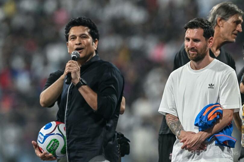 【12月15日 AFP】サッカーアルゼンチン代表のリオネル・メッシがインドを訪問する「GOATツアー」は14日、2日目を迎えた。混乱に陥った初日とは対照的にイベントは順調に進み、メッシは観客席に向かってボールを蹴り込むと、インドの伝説的な元クリケット選手サチン・テンドルカール氏と対面した。