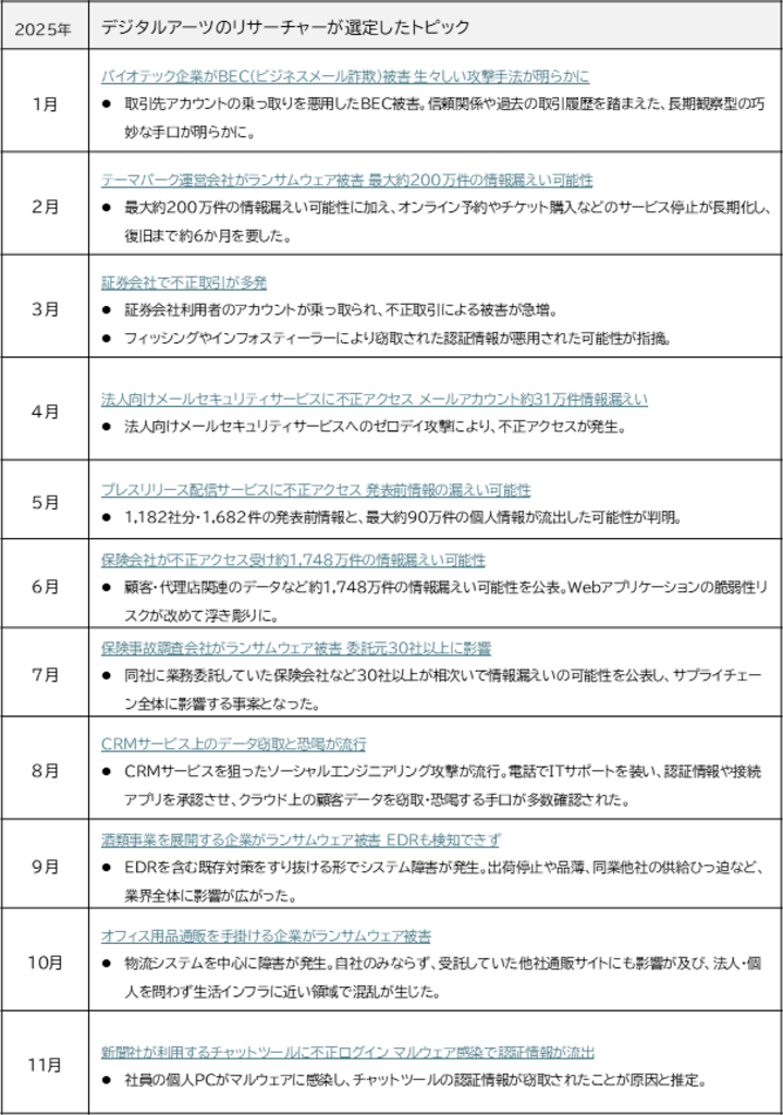 本レポートでは、2025年1月から11月までに公表された国内外のインシデントの中から、当社リサーチャーが特に注目した事案を月ごとに整理しています。