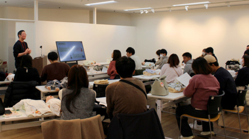 助産師監修の動画を視聴した後、1組ずつに用意した赤ちゃん人形とベビーバスを使い、沐浴手順を学べる体験を実施。出産前に沐浴の実践的な体験ができた点について、参加者からは好評の声が寄せられました。
