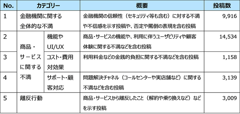 このたび、株式会社NTTデータ経営研究所(所在地:東京都千代田区、代表取締役社長:山口 重樹、 以下 当社)は、SNS上の投稿の中で表現される金融機関に対する「不満」に注目し、X上で発信された顧客の声の分析とその結果(以下、本調査)をまとめましたので、お知らせします。