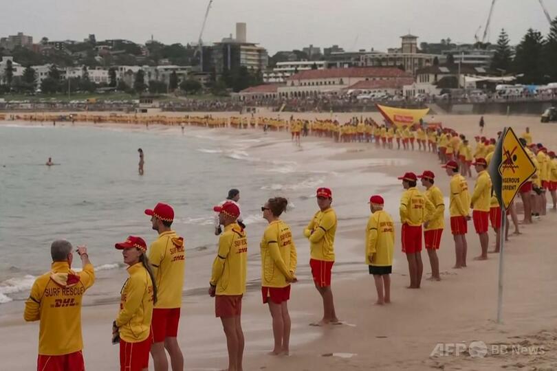 犠牲者悼み黙とうを捧げるライフセーバー 豪ビーチ銃撃事件
