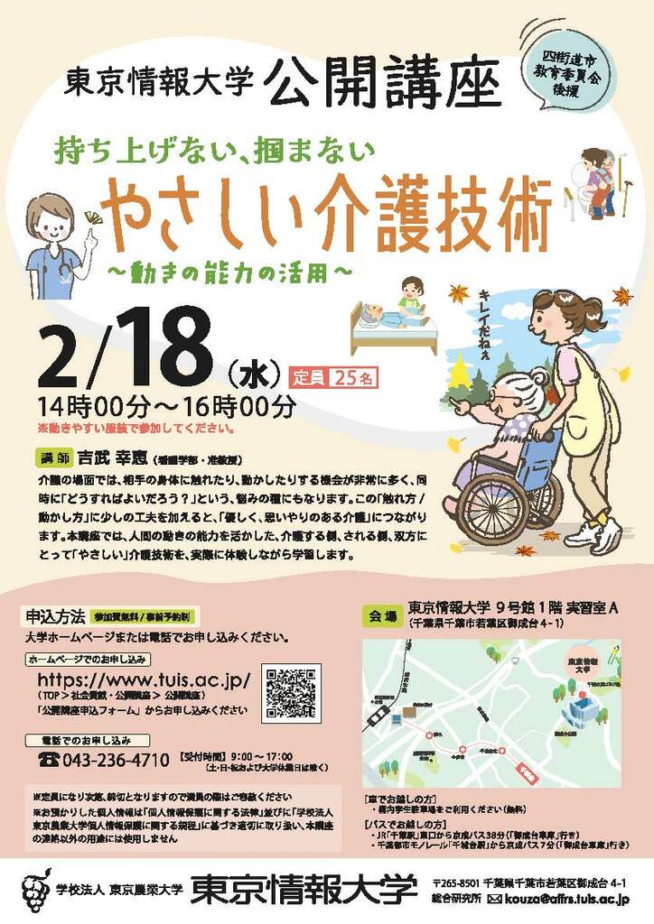 東京情報大学(設置者:学校法人東京農業大学)では、地域住民の皆様に東京情報大学の学びに触れていただく機会として、「持ち上げない、掴まない、やさしい介護技術 ~動きの能力の活用~」をテーマに公開講座を開催します。