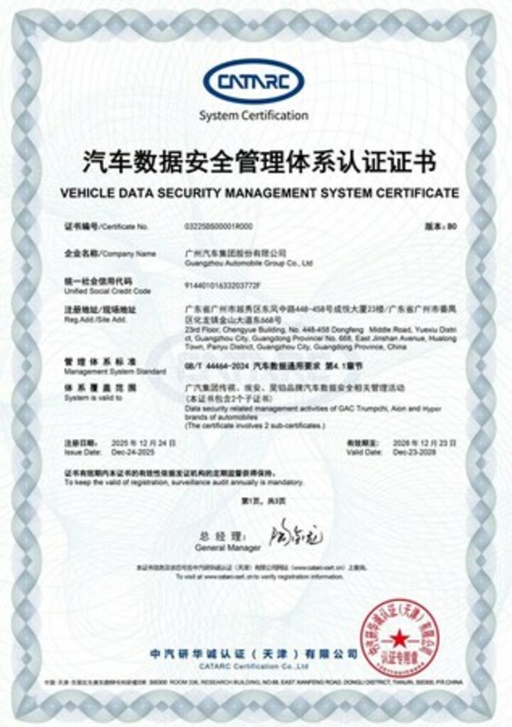 天津(中国)および広州(中国)、2025年12月31日 /PRNewswire/ -- GACは12月24日、業界初となる自動車データ・セキュリティ管理システム認証(認証番号:03225DS00001)を取得し、車両データ・セキュリティ分野において権威ある評価をあらためて獲得しました。この成果は、業界における体系的なデータ・セキュリティ構築の最前線にGACが立っていることを示すものであり、インテリジェント・コネクテッド時代における自動車データ・ガバナンスの新たなベンチマークを確立するものです。