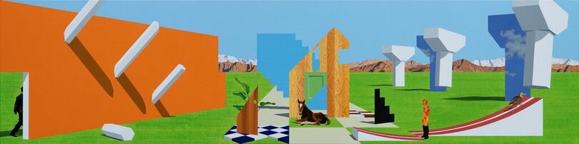 私の絵画において立ち現れる時空間は、依然として「不特定」である。異なる時間や場所から選び取られたイメージ(構造物、オブジェ、人物)を、造形性のみに基づいて配置することで、画面の中にぎこちない調和を生み出している。関連性を持たない対象たちは、それぞれが存在しているだけで共存することはなく、ただ違和感を生じさせるにすぎない。私は決して物語を構築しようとはせず、制作を終えた後においても、自ら定義することのできない画面を志向している。ゆえに、一点透視の画面各所に配置された人物やオブジェはキャラクター性を失い、ジェスチャーだけを残したまま漂っている。