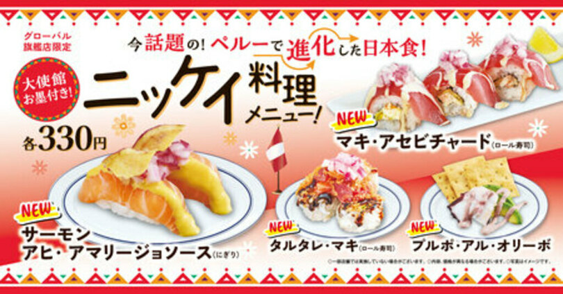 ニッケイ料理とは、ペルーと日本の食文化が融合した料理で、1,000人以上の料理専門家の投票で決定される国際的な食のアワード「世界のベストレストラン50」にて、ペルー共和国にあるニッケイ料理レストランが昨年、1位に選ばれるなど、今注目度の高い料理です。そこで、くら寿司では、ニッケイ料理を新たに4商品開発し、国内のお客様のみならず、様々な方に楽しんでいただけるよう、多くのインバウンドの方がお越しになるグローバル旗艦店6店舗で販売します。