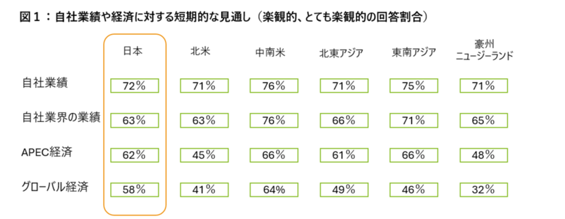 本調査では世界各地域の経営者の70%以上が短期的な自社業績について前向きな見方を示しました。他方、それに比べてグローバル経済の展望は、それぞれ10ポイント以上ダウンしており、楽観する割合が低くなりました。これは、予測可能な過去のパターンと変動する未来の併存、すなわち自社に近いコントロール可能な要因への楽観と、遠い外部要因への慎重さの対比として、調査対象リーダーの思考を顕在化しました。日本の経営者も同様の傾向を示しつつ、世界経済やAPEC地域経済の見通しについてより楽観的な傾向を示しました。