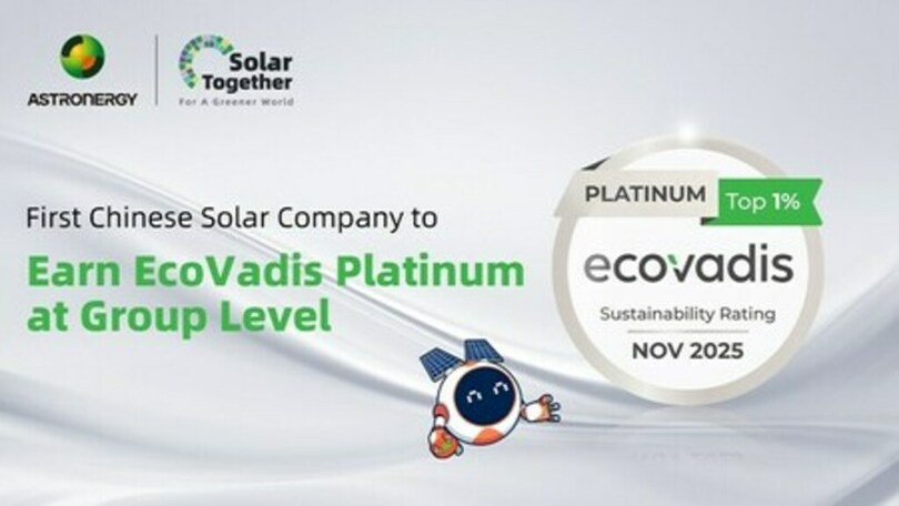 杭州(中国)、2026年1月7日 /PRNewswire/ -- EcoVadisが発表した最新のサステナビリティ評価結果において、Astronergyは86点という卓越したスコアを達成し、グループ・レベルで「プラチナ」評価を獲得しました。これによってAstronergyは中国PV業界で初めて同認証を取得した企業となりました。この「プラチナ」という評価はEcoVadisが授与する最高位のサステナビリティ評価であり、Astronergyは全世界の評価対象企業のトップ1%に位置づけられたことになります。