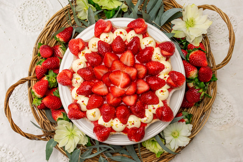 “いちごさん”の中まで赤い果肉の魅力を引き立てるため、半割のイチゴを中心に使用し、外側にはハート形のイチゴを重ねました。桂花やフレーズフレークをアクセントに添え、見た目の華やかさと全体のバランスにもこだわっています。