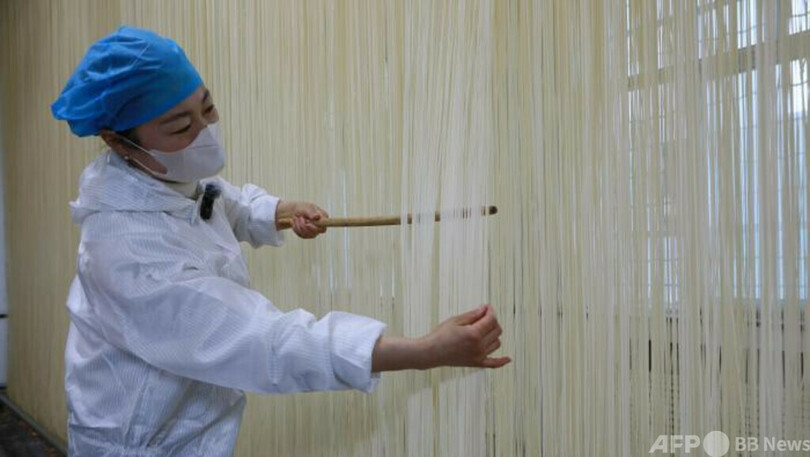 【1月14日 東方新報】厳寒の折、甘粛省(Gansu)武威市(Wuwei)民勤県双茨科鎮の干し麺工房では、地元産の良質な乾燥地向け強力粉を原料に、こねる、寝かせる、麺を巻く、竿に掛ける、引き伸ばす、天日干しするなど10数工程を経て、髪の毛ほど細く、中が空洞で透き通った手打ちの干し麺が職人の指先から生み出されている。標準化された工場内は活気に満ち、作業が慌ただしく進む。