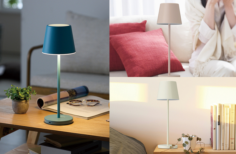 e angleの『カラーデザインシリーズ』は、お部屋をおしゃれに彩るカラーとデザインが特長です。今回、新たなラインナップとして、「もっと自由に、明かりを楽しみたい」というお客様の声にお応えし、電源コードに縛られないコードレスタイプのインテリアスタンドを発売いたします。