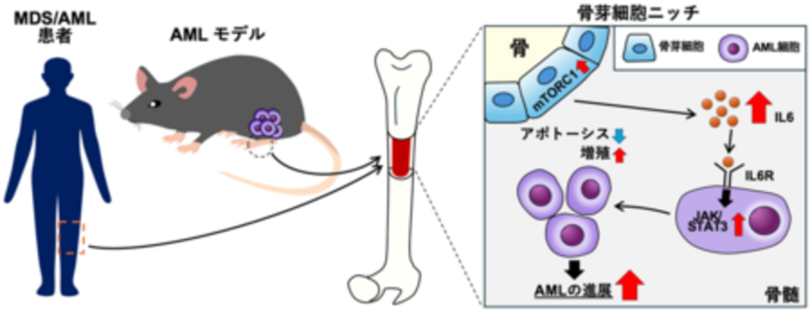 本研究成果は、骨芽細胞のmTORC1シグナルがAML治療における有望な創薬ターゲットとなる可能性を明らかにしたものであり、AMLだけでなく、様々な難治性がんの治療成績向上を指向する「ニッチ標的型抗がん剤の創製」に繋がることが期待されます。