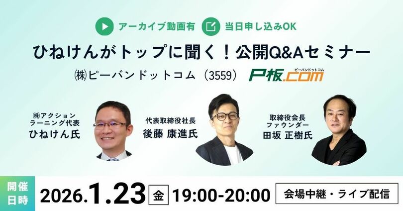 プリント基板のネット通販「P板.com」を運営する株式会社ピーバンドットコム(東証スタンダード・名証メイン 3559、以下当社)は、2026年1月23日(金)に開催される個人投資家向けオンラインイベント「ひねけんがトップに聞く!公開Q&Aセミナー」(運営:(株)インベストメントブリッジ)に登壇し、個人投資家の皆さまに向けて当社の事業概要および今後の成長戦略についてご説明いたします。