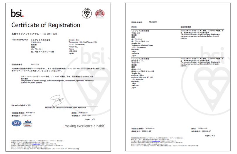 ISO9001は、企業が提供する製品やサービスの品質が法規制や顧客からの要求を満たしており、かつPDCAサイクルを回して継続的に品質を向上する品質マネジメントサイクルやその体制が整っていることを証明するものです。シンプレクスは、公共システムにおけるシステム戦略、ソフトウェア開発、保守、運用業務及びサービス基盤の提供に関し、本認証を取得しました。