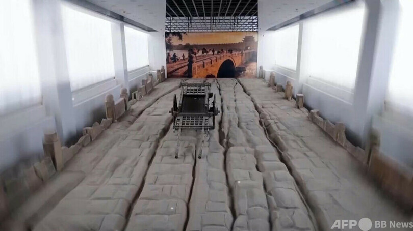 黄砂岩の切り石で築かれた単孔アーチ橋で、現存部分は全長22メートル、幅17メートルで比較的完全な状態で保存されてきたものです。橋面には古代の車輪の痕跡4本が鮮明に残っており、最も深い部分は10センチに達し、明清時代の太原城における交通の往来や商業の繁栄を生き生きと物語っています。(c)CGTN Japanese/AFPBB News