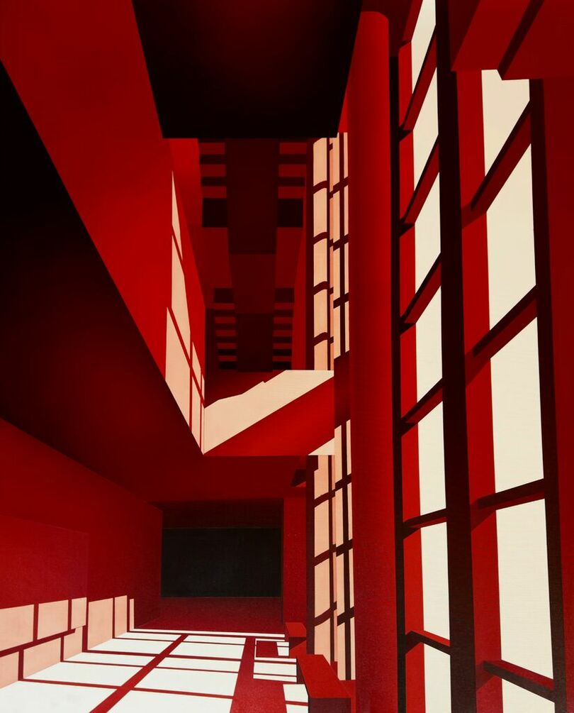 描かれるのは、すべて米山が現実に見た物や空間や、現実に起きている現象です。しかし制作の過程で情報が削ぎ落とされていくうちに、絵画は具象と抽象が往来するような雰囲気を帯びてきます。赤いグラデーションで具象的な空間が、白で突出した形が抽象的に配置され、図形的に捉えた空間に置き換えられていきます。