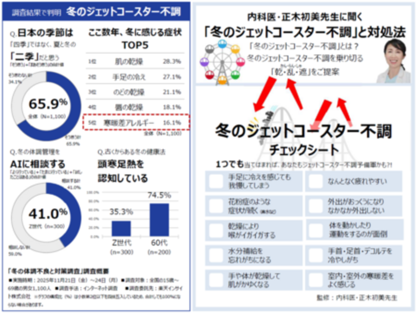 第一三共ヘルスケア株式会社(本社:東京都中央区)は、全国の15〜69歳の男女1,100人を対象に、冬の体調不良と対策に関する実態調査を行いました。調査によると、8割以上の人が季節の変化が極端になっていると感じ、およそ4人中3人が「冬の体調管理が難しくなった」と実感していることが分かりました。当社ではこのような急変する気候の影響を受ける冬の不調のことを「冬のジェットコースター不調」と命名し、ジェットコースター不調に陥る危険性を確認する「チェックシート」を内科医・正木初美先生監修の下に開発しました。