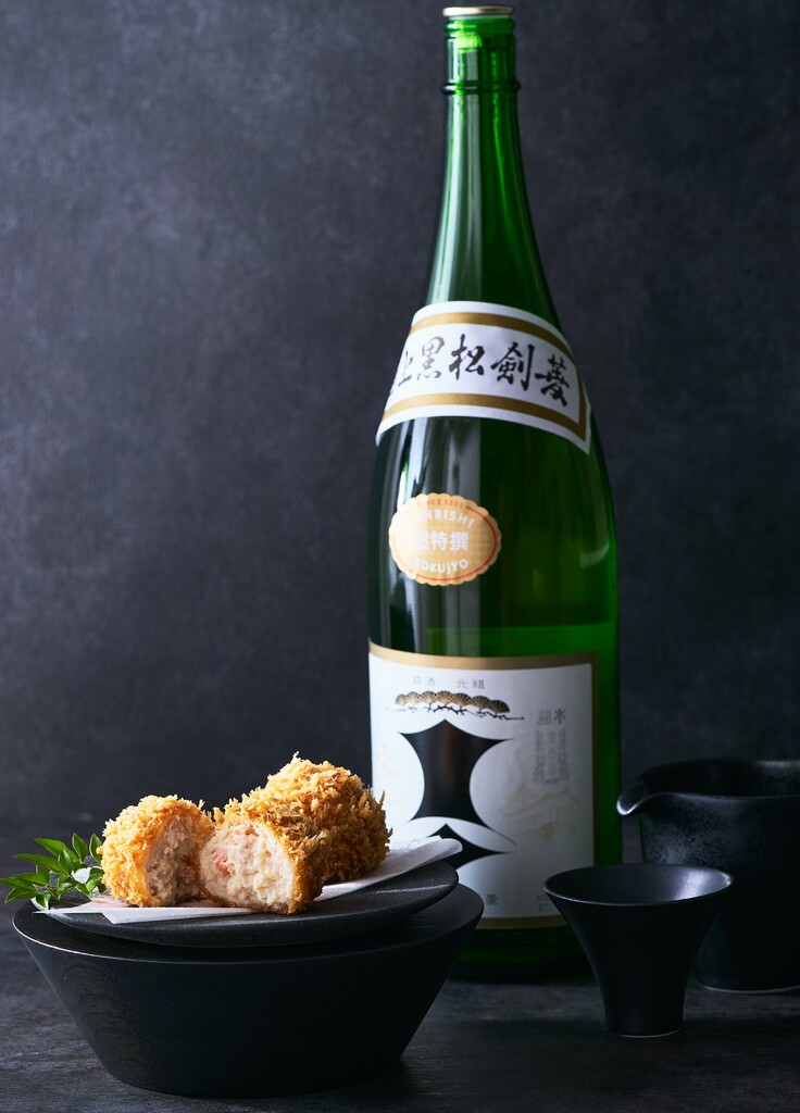 芳醇な香りの極上黒松剣菱に、酒かす、クリームチーズ、鮭、白みそを合わせた日本酒クリームをサクサクの衣で包みました。細かく刻んだゆずの皮の香りがアクセント。イベント会場で揚げたあと、さらに霧吹きで極上黒松剣菱を吹きかけます。日本酒との相性も抜群です。