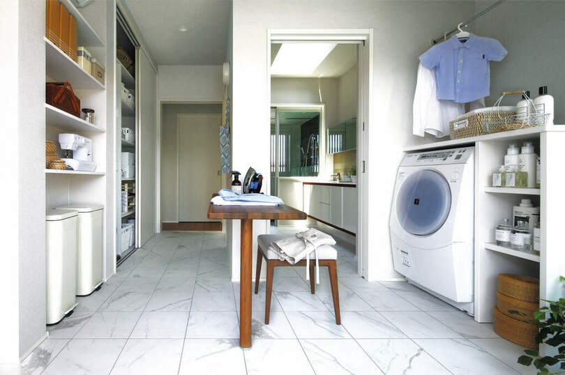 洗濯・乾燥機を、まるで収納家具のようにすっきり隠す設置方法があります。専用の室内干しスペースを設けるのが理想的ですが、それが難しい場合は、 キッチンに隣接した空間や、2階ホール、廊下の一角などに「洗濯コーナー」を設けるのも一案です。さらに、その空間にはちょっとしたテーブルや椅子、ベンチなど、くつろげる家具を配置することで、衣家事をより快適に行える環境が整いますよ。