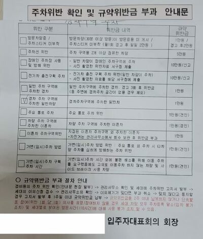 案内文には、入居者代表会議が決定した駐車規則と違反金について細かい記載がある。軽自動車が一般区画に駐車した場合や普通車が軽専用区画に駐車した場合、それぞれ1万ウォンの違反金を科す内容だ。