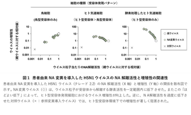 これらにより、H5N1ウイルスは、HAだけでなくNAも微調整しながら段階的にヒトへ適応していくことが示唆されました。