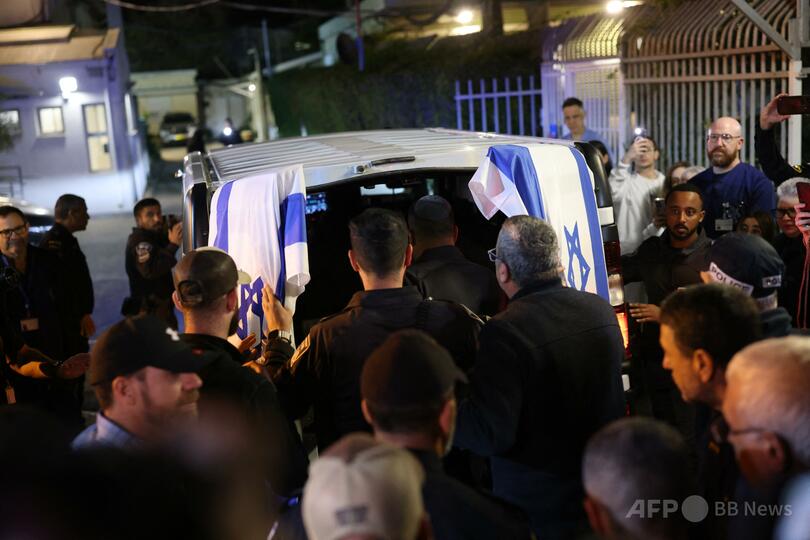 警察官だったラン・グビリさんの遺体はイスラエルに移送された。道路わきでイスラエルの旗を振る人たちが、遺体を乗せた車列を見送った。
