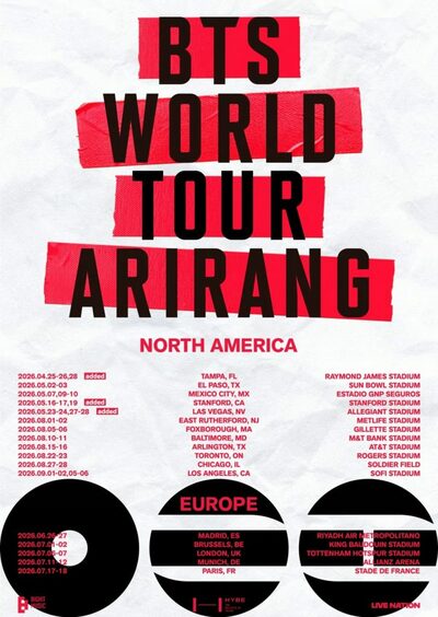 【01月27日 KOREA WAVE】韓国のグループBTS(防弾少年団)が開催するワールドツアー「アリラン」の北米、欧州全41公演が24日までに完売した。