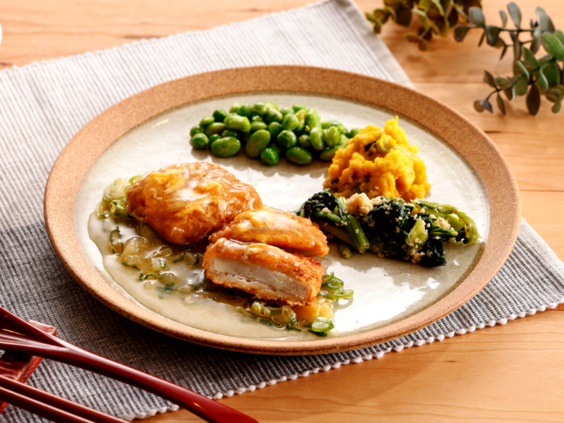 副菜は、高野豆腐のそぼろが入った小松菜のおひたし、バターソースで仕上げたかぼちゃ入りポテト、2種のお豆を使ったお豆の生姜あんです。