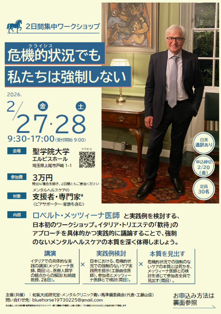 聖学院大学 心理福祉学部 和氣大成研究室(埼玉県上尾市/学長:小池茂子)・メンタルクリニック青い馬準備委員会(代表:工藤由佳)は、2月27日(金)・28日(土)に2日間集中ワークショップ「危機的状況(クライシス)でも私たちは強制しない」を開催します。イタリア・トリエステの元メンタルヘルスセンター長ロベルト・メッツィーナ氏を招聘した、日本初の実践的ワープショップ。強制のないメンタルヘルスケアの本質を「歓待」のアプローチから学びます。自由の象徴「青い馬」が街頭進出した1973年2月25日を記念する、支援者・専門家向けの有意義な機会です。