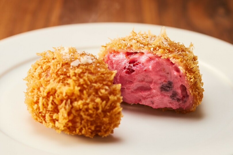 クランベリーとクリームチーズの味わいに、トッピングのパルメザンチーズの香りがアクセント。ピンク色の断面が可愛い、甘酸っぱさがクセになるスイーツコロッケです。