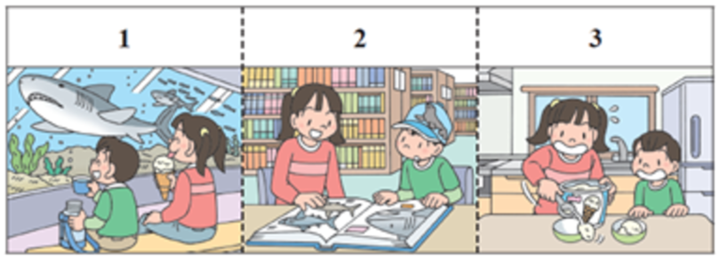イラストについての質問を聞いて、答えとしていちばんあっているものを1~3の中から1つえらびなさい。