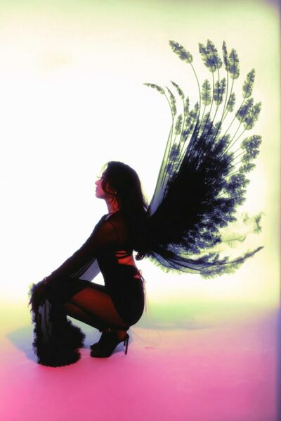写真では、オールブラックの衣装に身を包み、真紅の照明の中で幻想的な雰囲気を演出。羽を思わせるアイテムをまとい、強烈なまなざしで圧倒的な存在感を放っている。