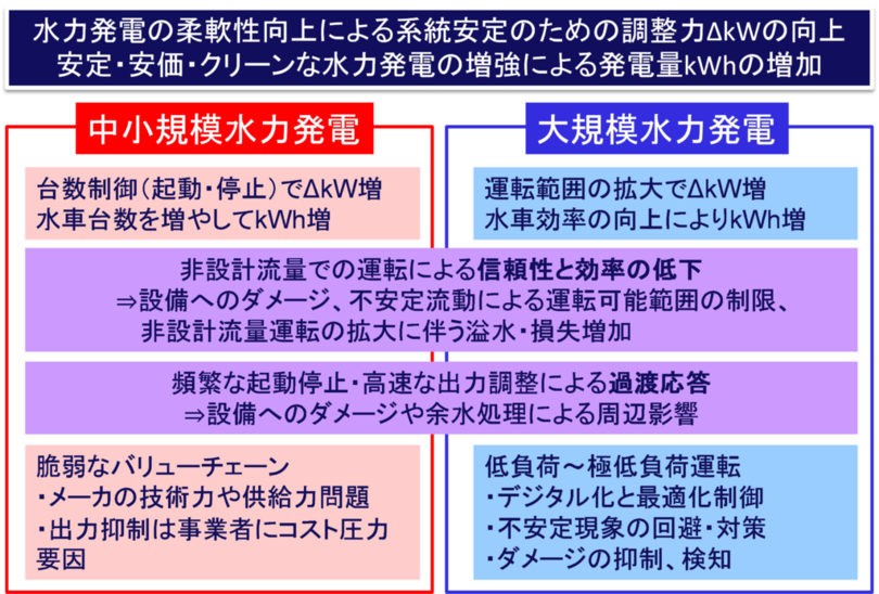 中小型水車は主に起動停止による台数制御での柔軟性向上を目指しますが、水系全体の運用や電力系統の中での発電所の立地を考えると、起動停止による台数制御だけでは出力調整が困難になる場合も想定されるため、大型水車と同様に、極低負荷運転を可能とする対応が必要である場合も考えられます。