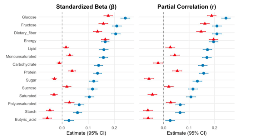 (図の説明) 酢酸と栄養素摂取量との関連(標準化回帰係数 ± 95%信頼区間;偏相関係数(r)と95%信頼区間)。回帰分析モデルでは、独立変数として酢酸を、従属変数として各種栄養素の摂取量を設定しました。Model 1は年齢と性別で調整されており、Model 2はさらにエネルギー摂取量でも調整されています。右側への推定値は正の関連を、左側への推定値は逆の関連を示します。赤がModel 1、青がModel 2を示します。酢酸摂取量は、年齢・性別・エネルギーで調整した場合に限り、炭水化物、糖質、飽和脂肪酸、でんぷん、酪酸との間に負の関連が認められました。