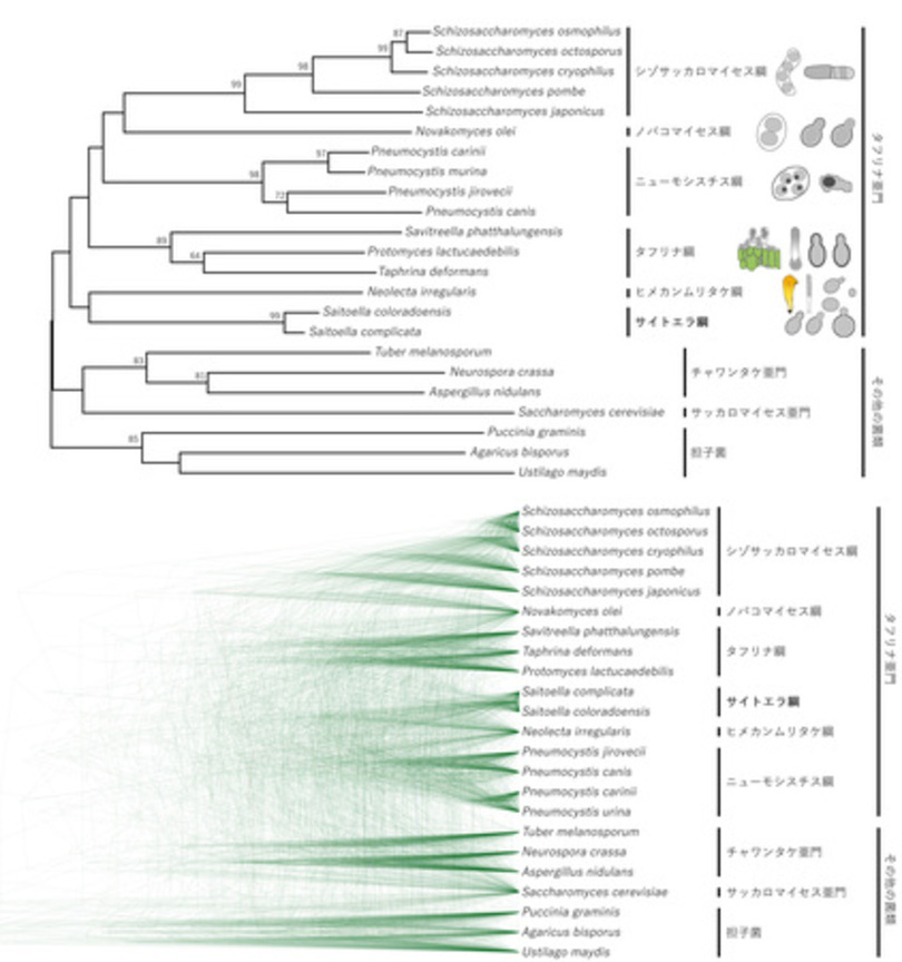 ロングリードシーケンサーを使用してゲノムを解読した結果、それぞれの染色体の全長が繋がったゲノム情報が構築できました。このゲノム情報を基に予測した各相同遺伝子の系統関係から生物種間の系統関係を推定すると、遺伝子配列を連結して推定した結果と同様にサイトエラ属はヒメカンムリタケ綱 (Neolectomycetes) との類縁関係が示唆されたものの信頼性は低く、元となるそれぞれの遺伝子の推定系統関係でも既存のどの分類群と明確に類縁とは言えないものでした(図)。さらに、サイトエラ属は遺伝子のアミノ酸配列が亜門内の多くのグループにとってもっとも類似していることがわかり、亜門内でも祖先的な配列を維持していることが推定されました。このことから、サイトエラ属は既知のグループとは異なる独特の系統であると言え、新綱4)「サイトエラ綱(Saitoellomycetes)」として記載しました。サイトエラ(Saitoella)は微生物学者・斎藤賢道博士5)に因んで献名された属名であり、綱という大きな分類群が日本人の名前を冠するのは珍しいことといえます 。