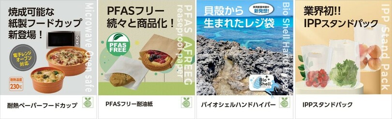 また、環境負荷低減への取組みが評価され、2025年度グッドデザイン賞(主催:公益財団法人 日本デザイン振興会)を受賞した当社の環境配慮型商品「ペーパーフードトレー」と「PFAS(フッ素化合物)フリー耐油袋」の展示も行います。